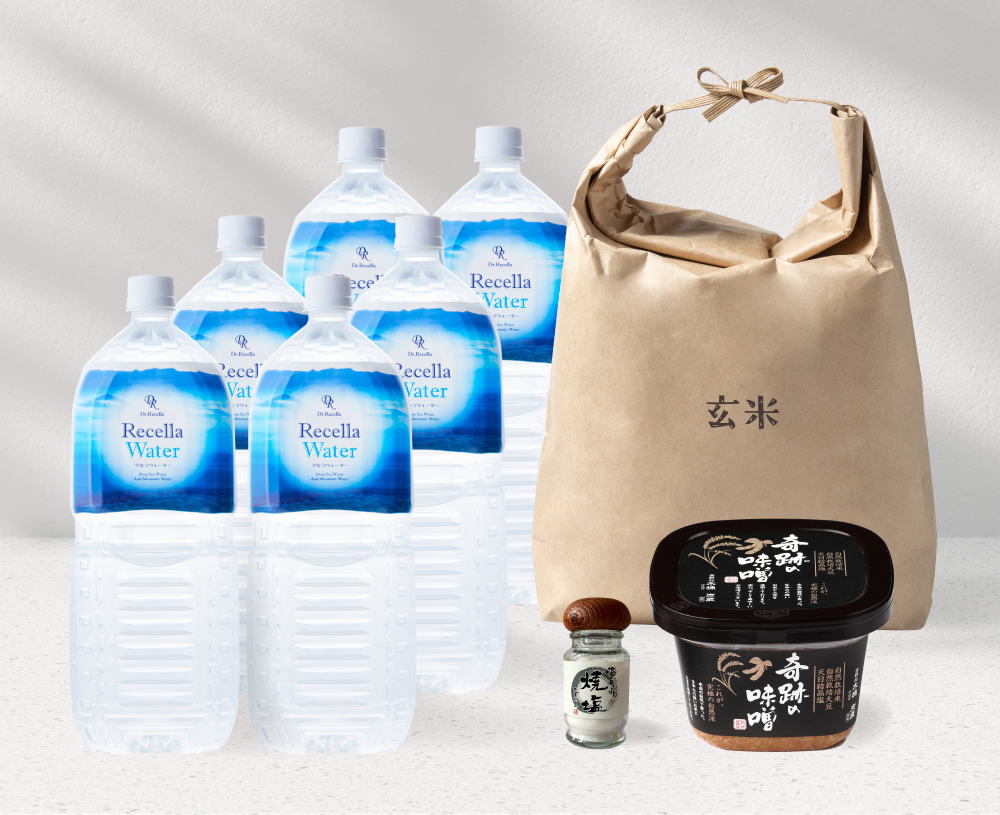 ■セット内容/玄米 5kg、奇跡の味噌750g、自然海塩「手塩」焼塩40g(瓶入)・100g(袋入)、リセラウォーター2L×6本