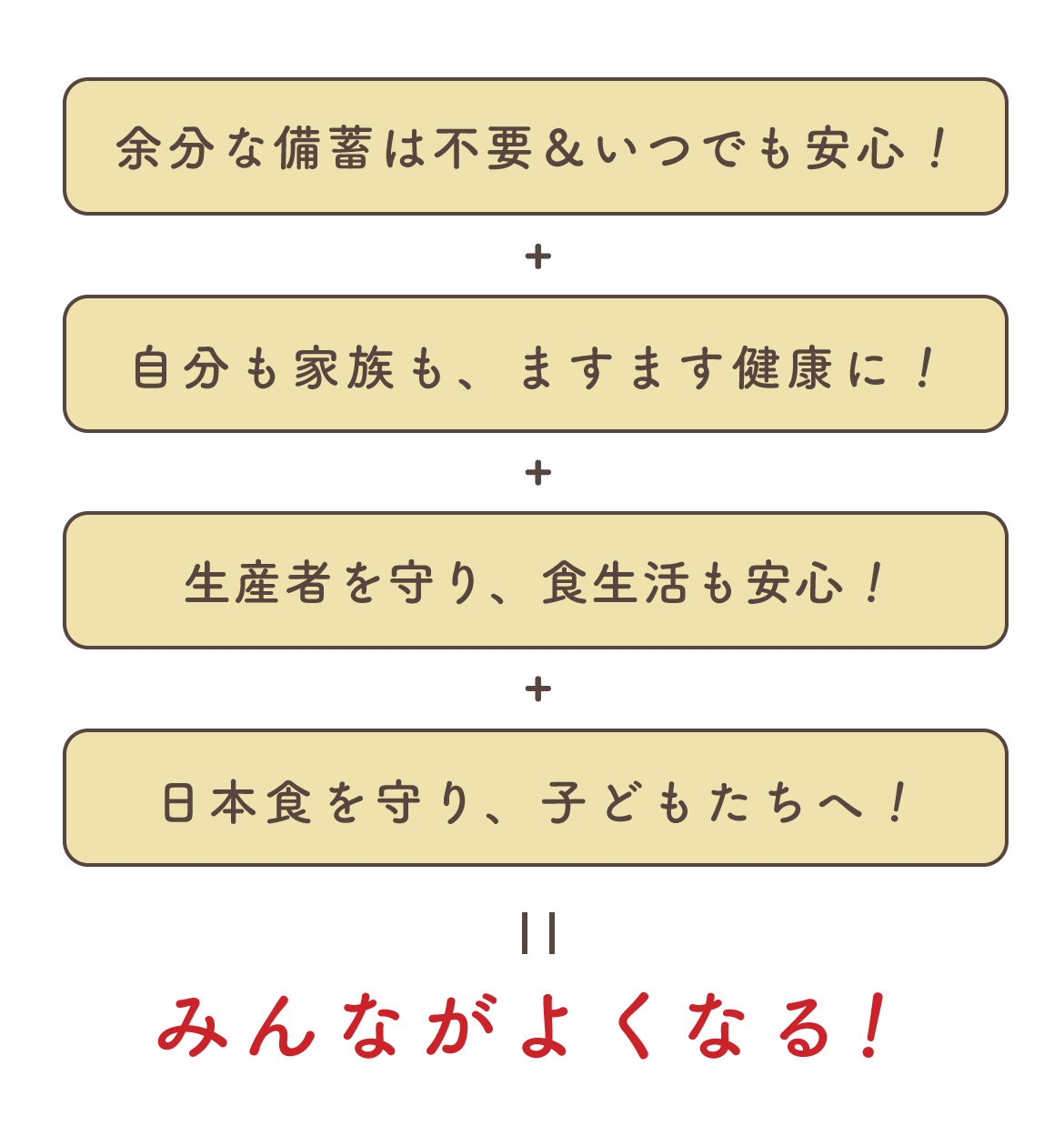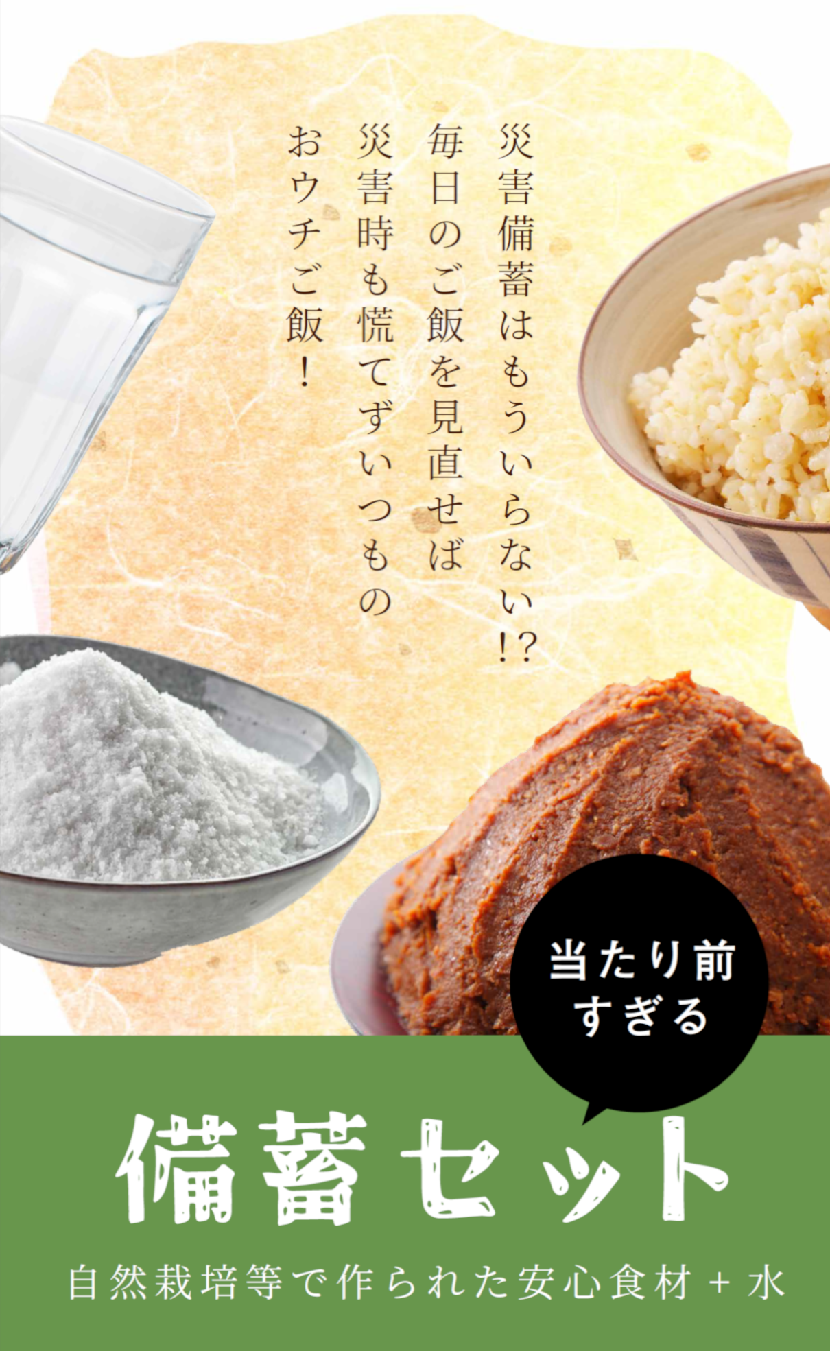 備蓄をきっかけにもう一度日本食の良さを見直して日常に取り入れ、生産者を支援することは、日本の食の豊かさや安全と、健康を見直すことにも繋がります。この備蓄セットには、そういった意味も込めています。
